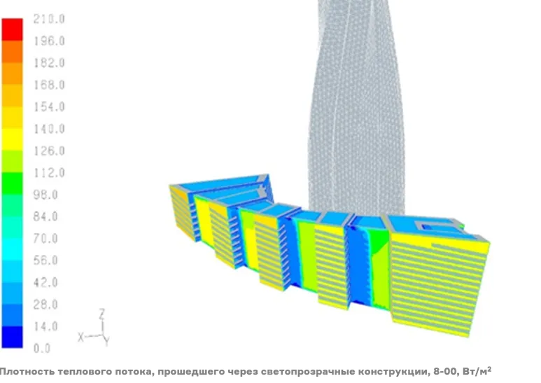 Проведен расчет теплопоступление от солнечной радиации для различного времени суток (с 6 до 22 по местному времени). Построен график изменения теплопоступлений в течении дня, определены максимальные значения. Было выявлено, что запроектированное решение в части системы кондиционирования воздуха – балки – является не только не эффективным, что показано в ходе проведения математического моделирования, но и капиталоемкими. Наиболее разумно использовать холодный воздухо-воздушный потолок (ХВВП). В результате полученные значения теплопоступлений способствовали корректировке мощностей закладываемого оборудования. Так по закону Стефана-Больцмана должна была повыситься теплоотдача поверхности, то есть теплообмен будет идти интенсивней. Очевидны и функциональные качества данного решения, на математических моделях температурных полей мы видим равномерное распределение температур.
